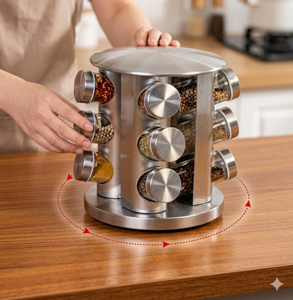Optimiza el espacio de tu cocina y mantén tus condimentos siempre a mano con este elegante especiero giratorio de 360°. Con un diseño moderno en acabado metálico, no solo es una herramienta funcional, sino también un accesorio decorativo que aporta un toque sofisticado a cualquier encimera.