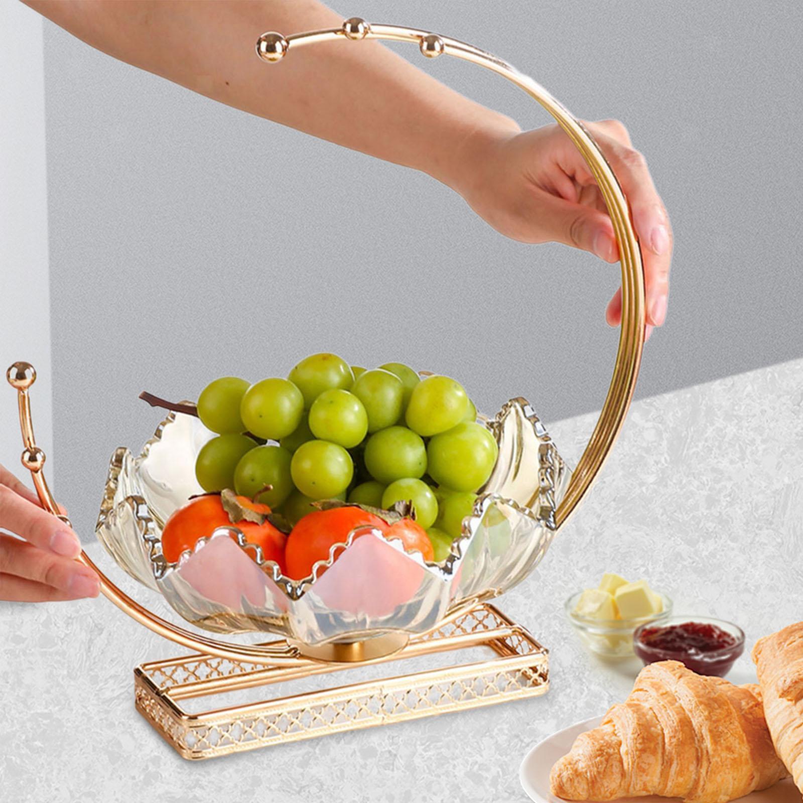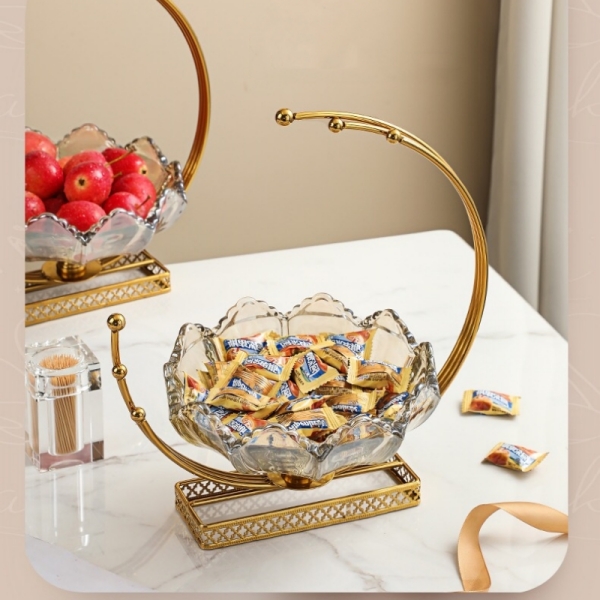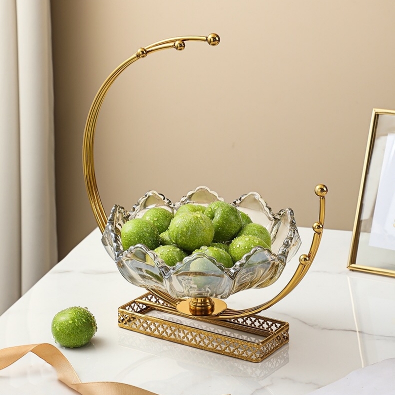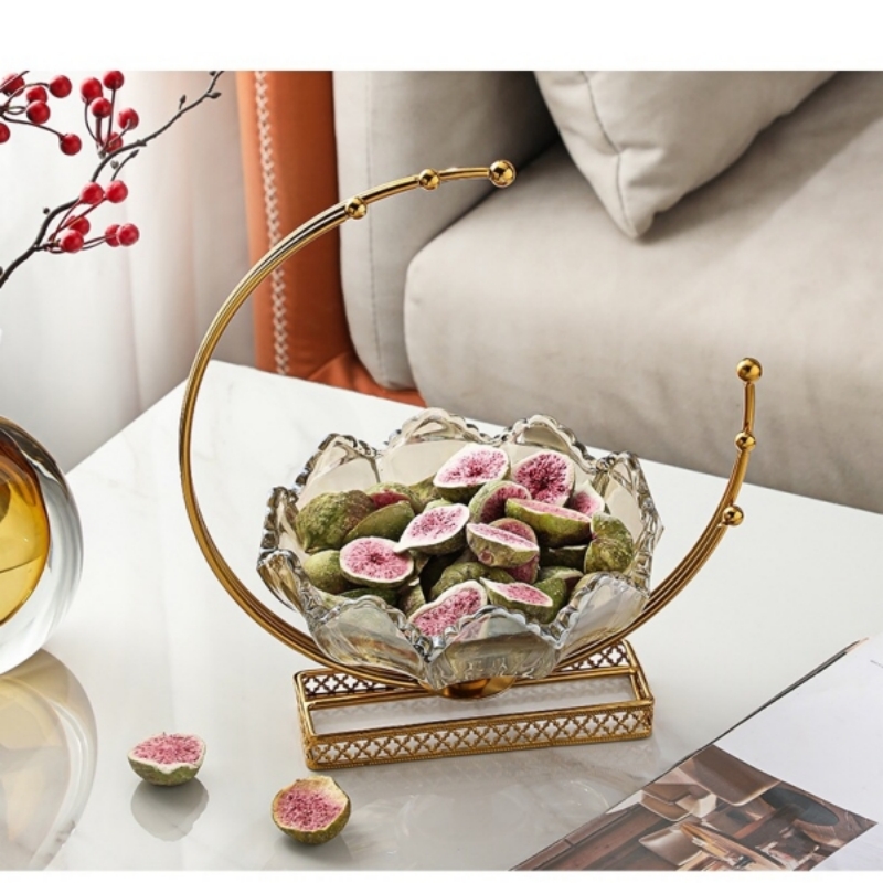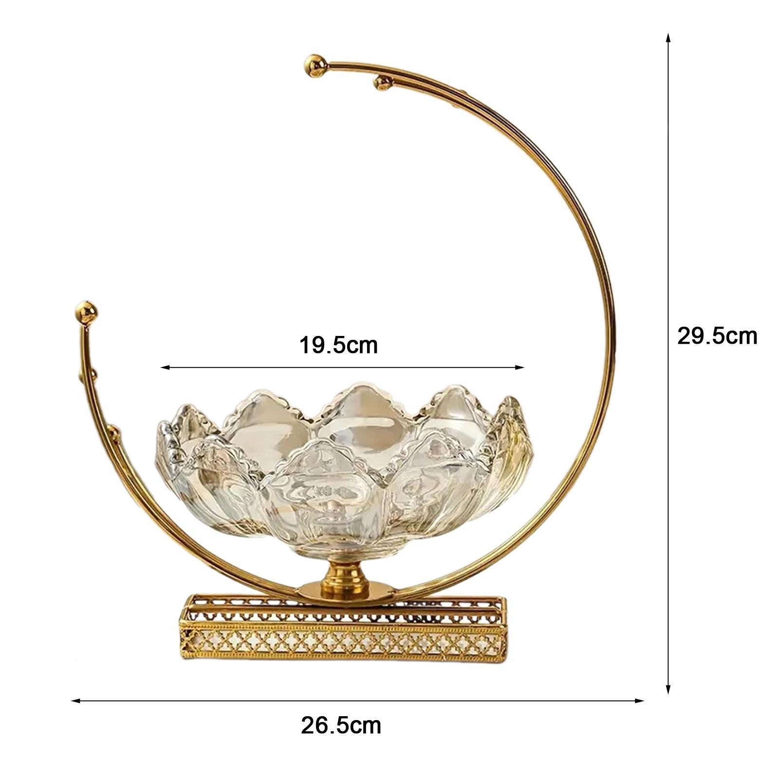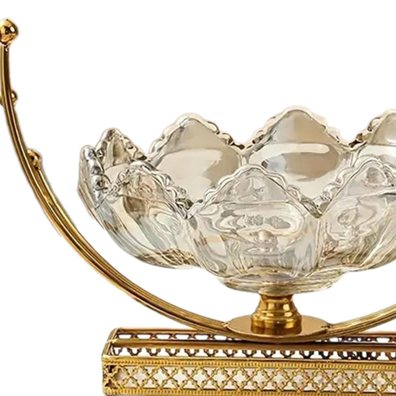 Este es un centro de mesa o frutero de lujo con base de metal dorado y cuenco de cristal.