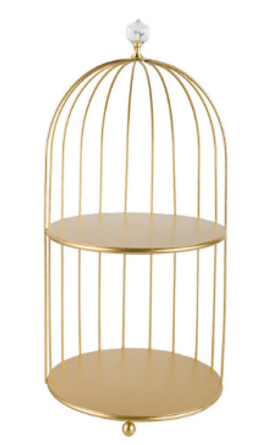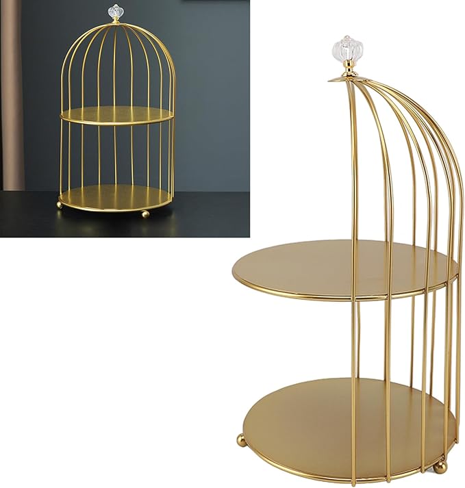 Se trata de un organizador de cosméticos, dulces, entre otras en forma de jaula de pájaros de hierro dorado de 2 niveles.