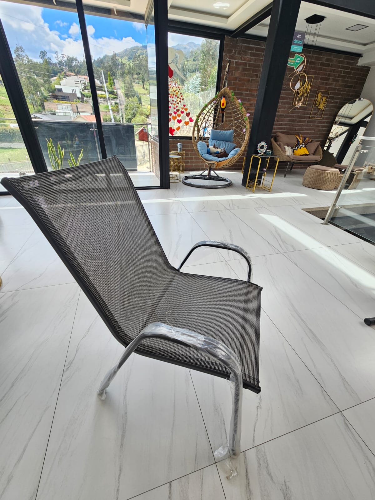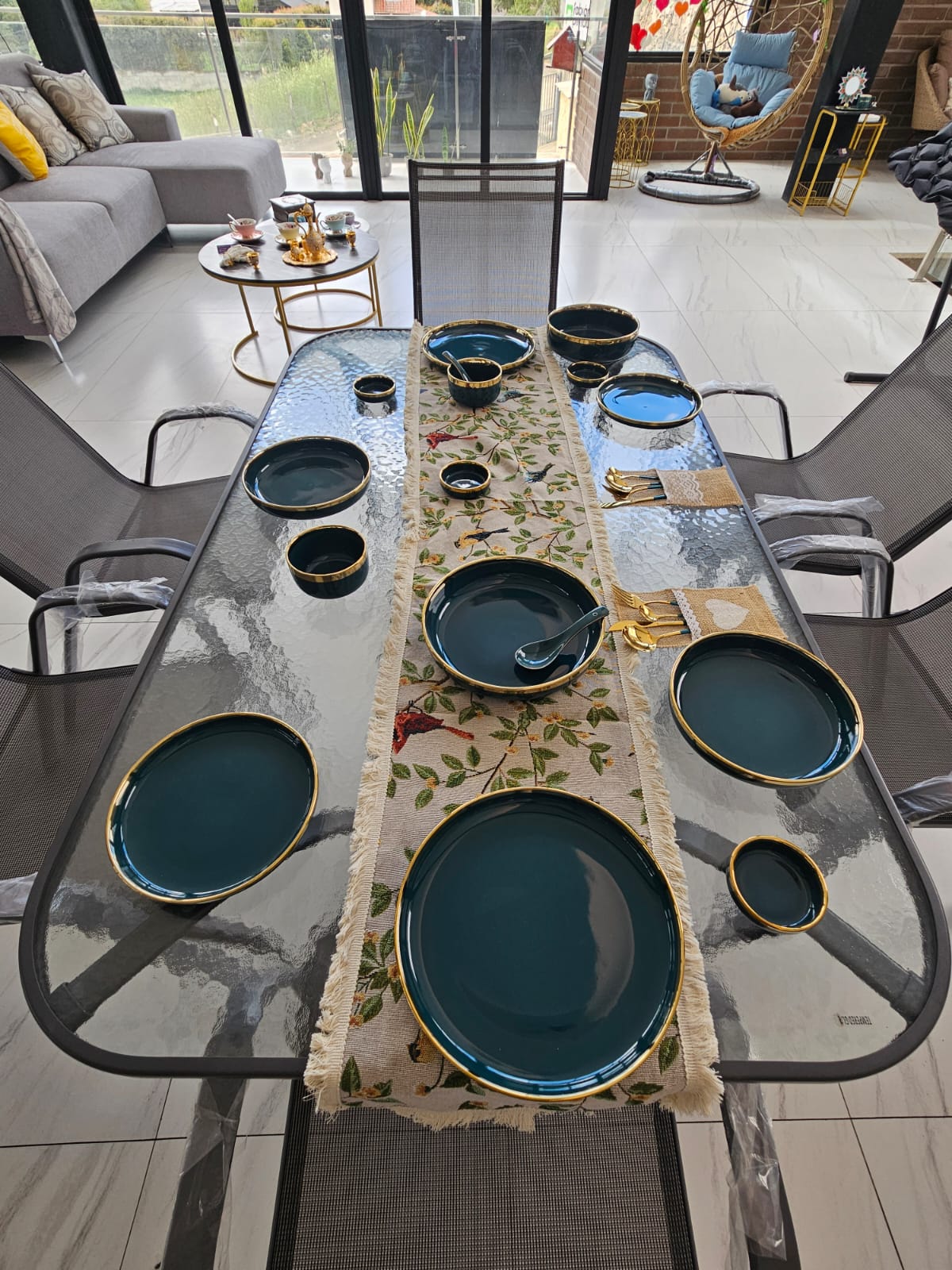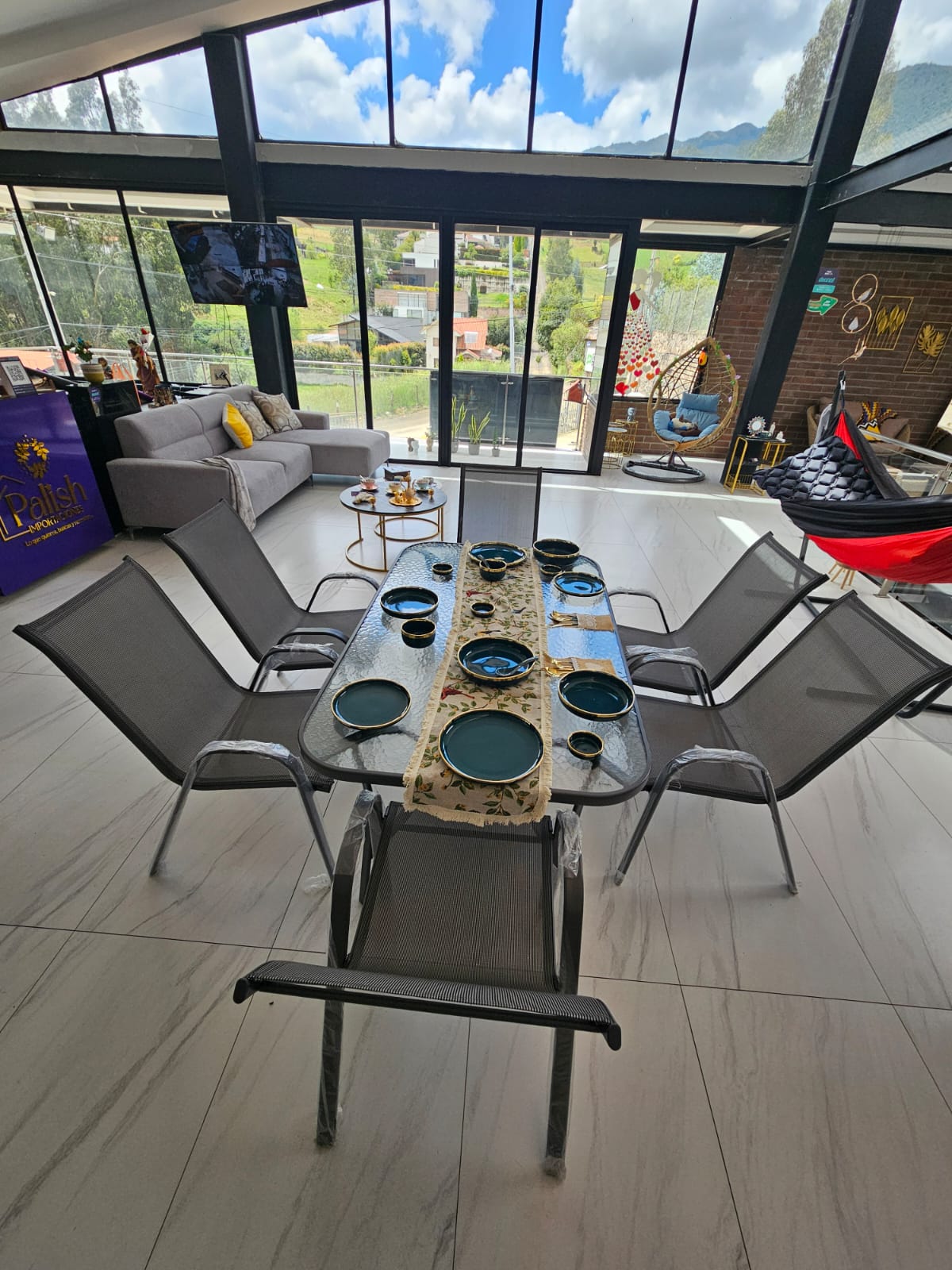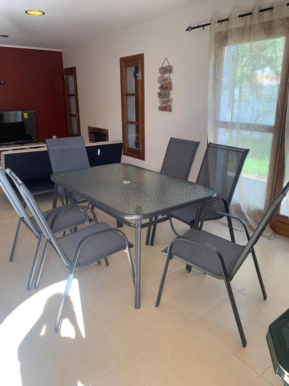 juego de comedor para patio de 7 piezas con 6 sillas de aluminio y textilene apilables y una mesa de vidrio templado.