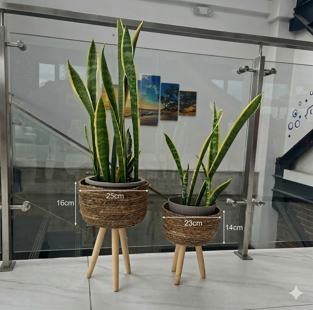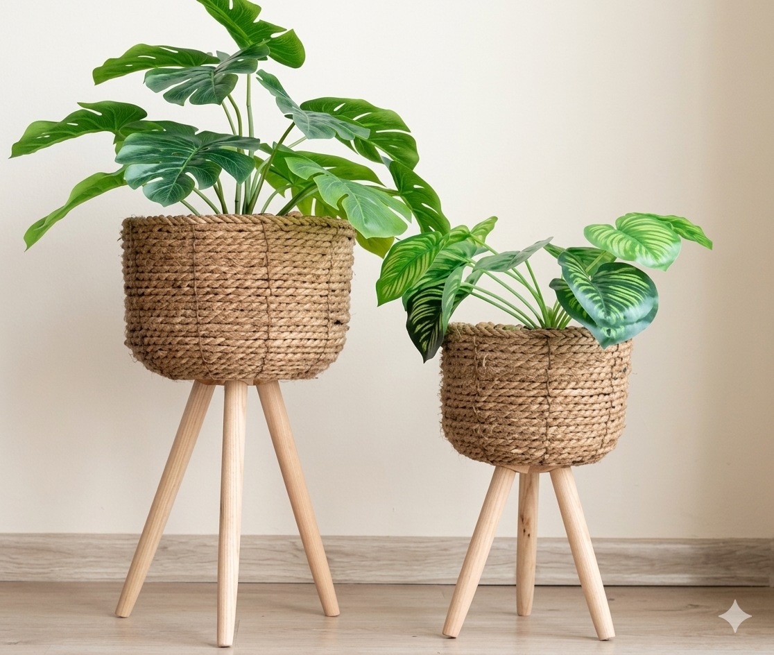Son macetas artesanales de cuerda trenzada con un diseño rústico y natural, elevadas sobre un trípode de madera sólida. Su estructura sencilla y materiales orgánicos las hacen perfectas para resaltar flores coloridas, integrándose con total armonía en cualquier rincón del jardín o hogar.