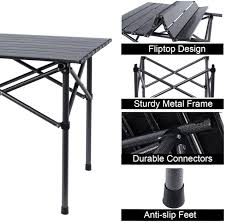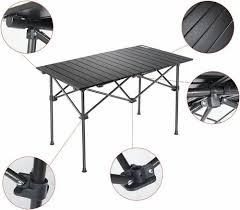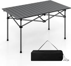 Mesa de camping plegable de aluminio de la marca, diseñada para ser impermeable, ligera y portátil, incluyendo un saco de transporte.