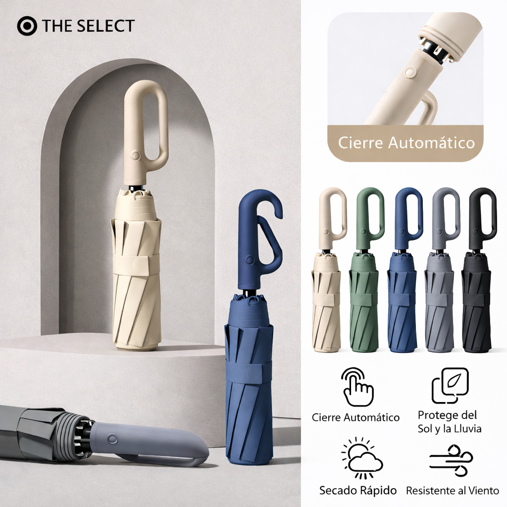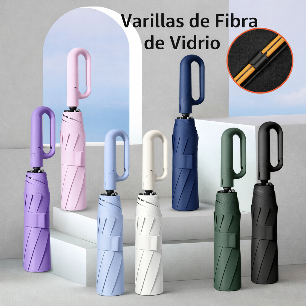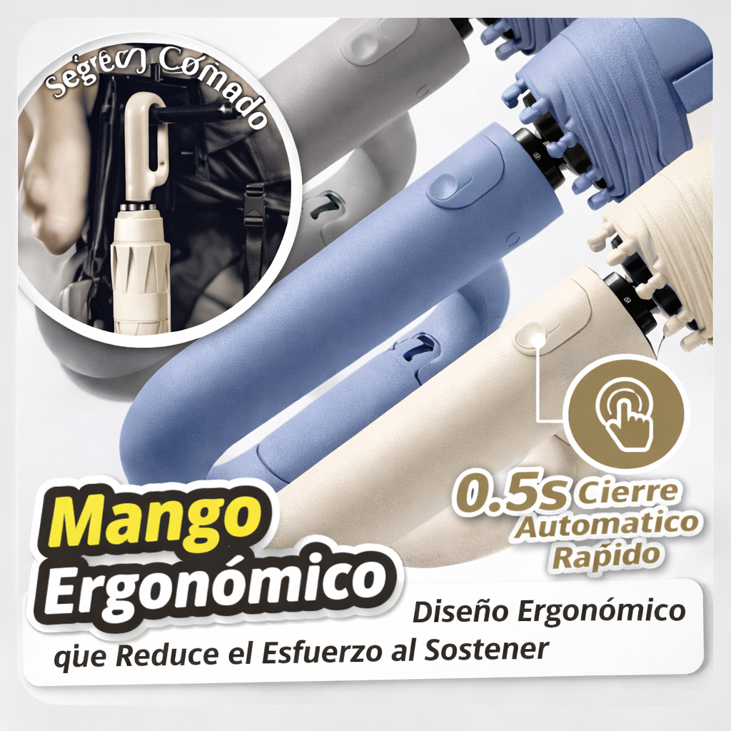 Paraguas compacto con diseño moderno y mango ergonómico tipo aro que facilita el agarre y permite colgarlo en cualquier lugar, ideal para llevar en bolso o mochila; cuenta con sistema de cierre automático rápido en solo 0,5 segundos, brindando practicidad en el uso diario, además de ser resistente, ligero y cómodo, perfecto para protegerte de la lluvia sin esfuerzo y acompañarte en viajes o actividades cotidianas.