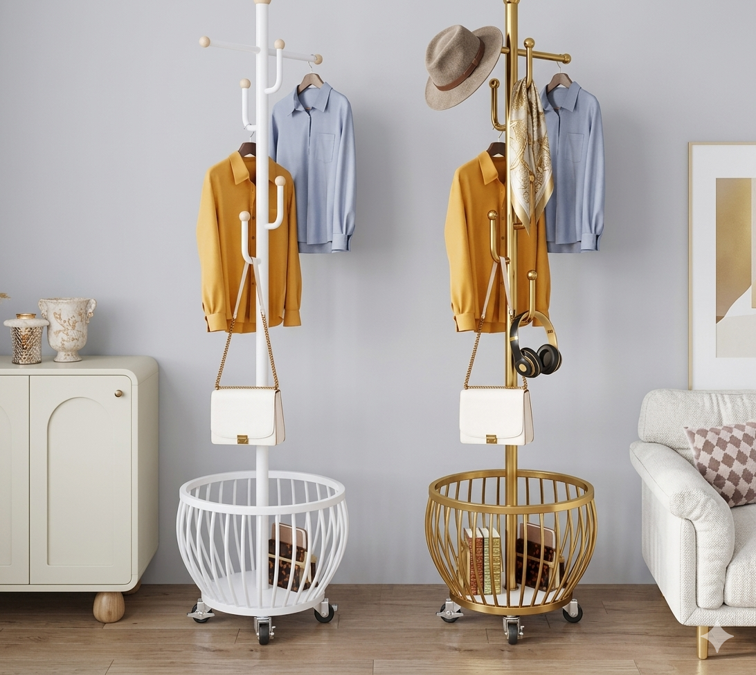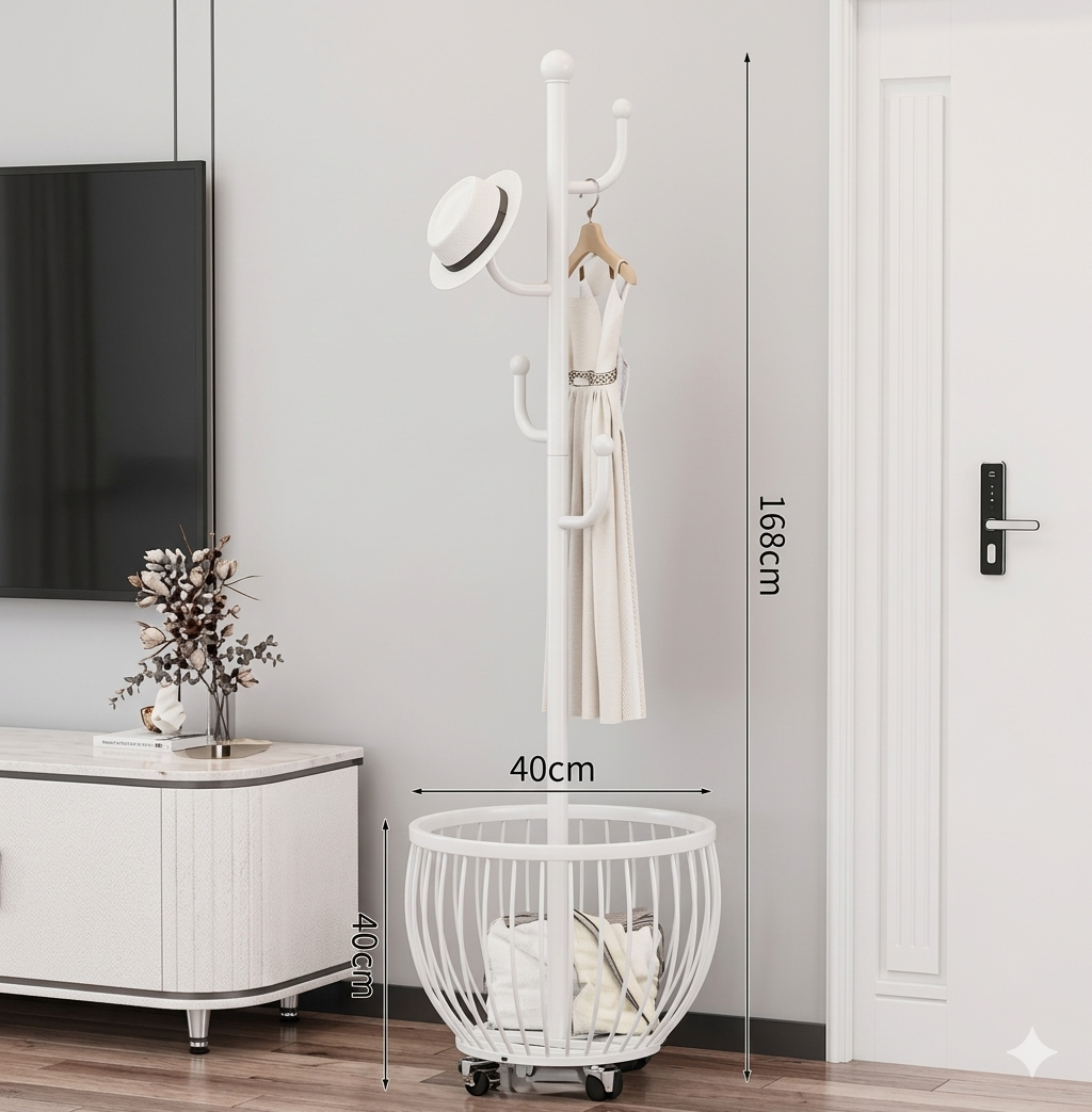 ¡Olvídate del desorden de una vez por todas! Este perchero multifunción es el combo definitivo que tu cuarto necesita: tienes un perchero de pie súper firme para colgar tus chaquetas, bolsos y sombreros sin que se doblen, y en la base, un canasto enorme ideal para la ropa sucia o esos cojines que siempre terminan en el piso. Lo mejor de todo es que tiene ruedas 360°, así que lo mueves por toda la casa sin esfuerzo, y su diseño minimalista hace que cualquier rincón se vea moderno y organizado en segundos. ¡Es la solución práctica y con estilo que te va a salvar la vida todas las mañanas!