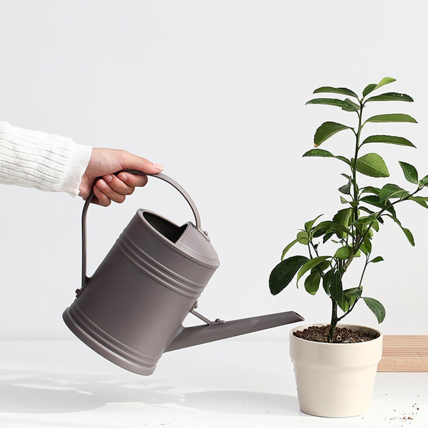 Regadera de plástico, diseñada para regar plantas. Cuenta con un pico extralargo para facilitar el riego preciso
