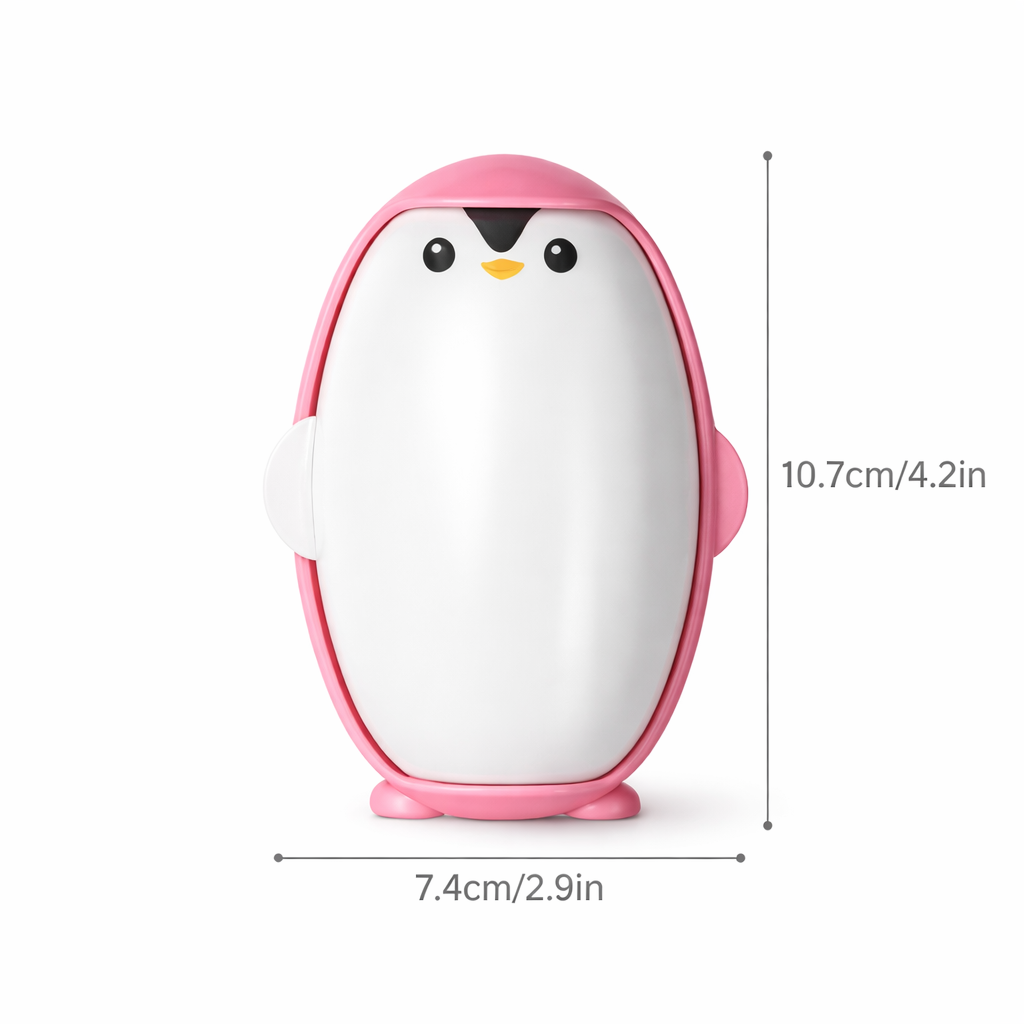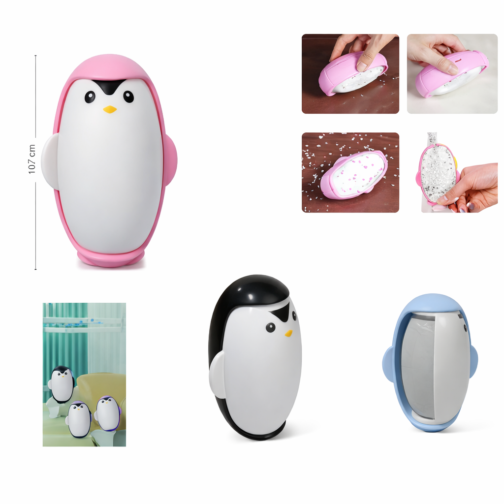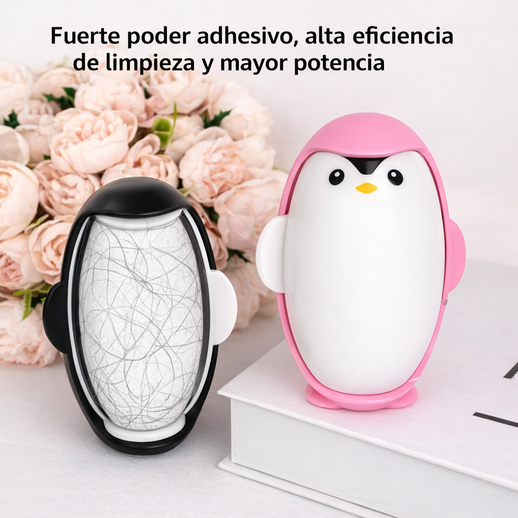 Removedor de pelusa reutilizable con diseño compacto en forma de pingüino, disponible en varios colores, ideal para limpiar ropa, muebles y superficies de forma rápida y sencilla; su superficie adhesiva atrapa eficazmente pelos, polvo y residuos sin necesidad de repuestos, y se limpia fácilmente para volver a usar, ofreciendo una solución práctica, portátil y duradera para el hogar o viajes.