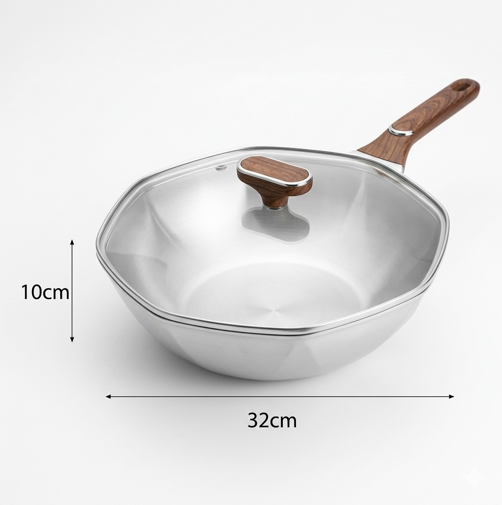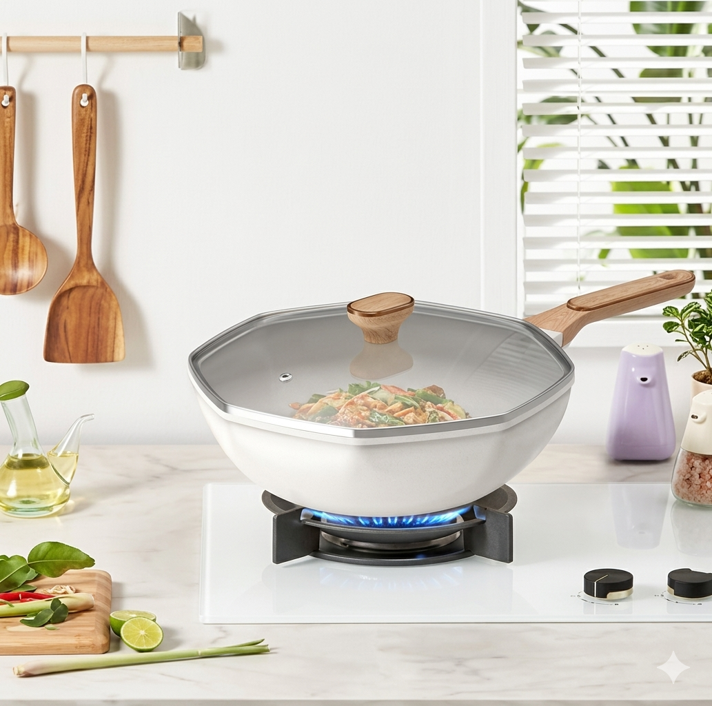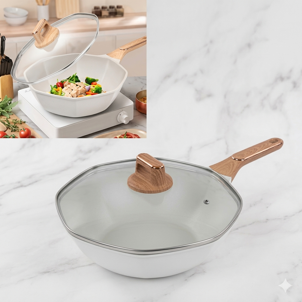 Diseño innovador que facilita el vertido y evita derrames. Su avanzado recubrimiento antiadherente color crema te permite cocinar de forma saludable con poco aceite, mientras que su tapa de vidrio templado y elegantes mangos con acabado en madera ofrecen un control total y un estilo sofisticado. Es la pieza perfecta para quienes buscan durabilidad, gran capacidad y resultados profesionales en un solo utensilio que además luce increíble en la estufa.