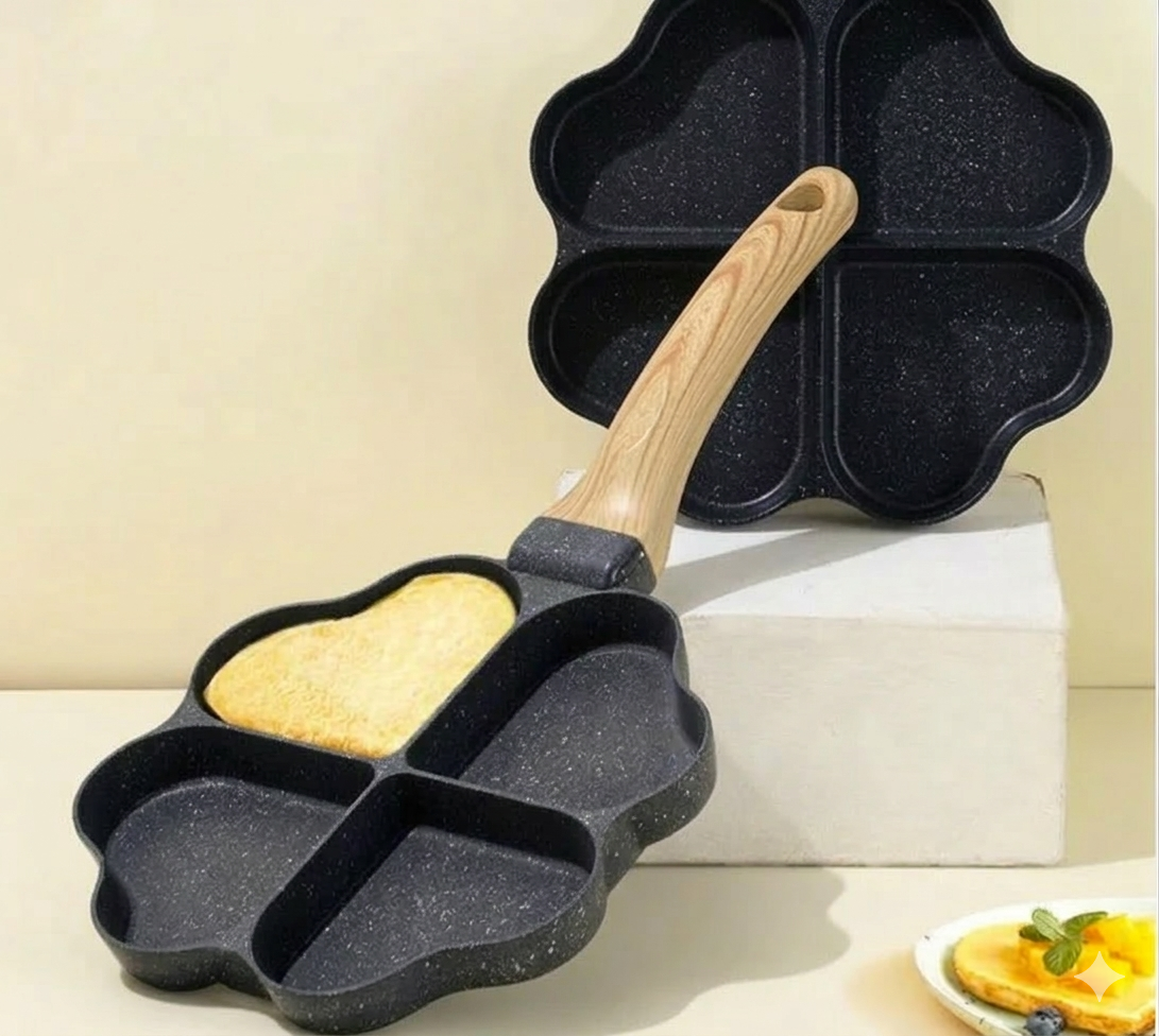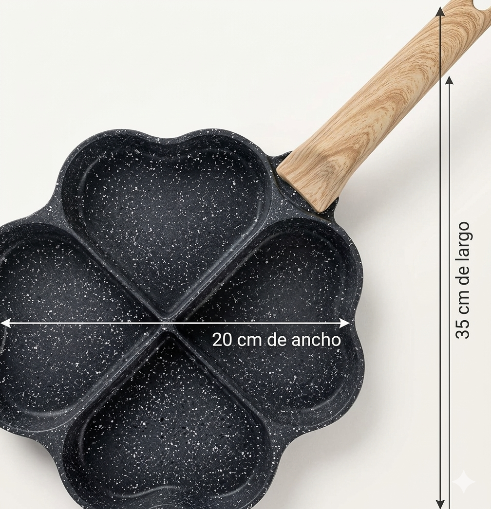 sartén con diseño de cuatro corazones es la elección ideal para quienes desean transformar sus comidas en un gesto de cariño, permitiendo cocinar cuatro porciones individuales con una forma romántica y perfectamente definida. Su avanzada superficie de granito antiadherente en color negro moteado asegura que los alimentos no se peguen y mantengan su silueta impecable, mientras que sus dimensiones de 35 cm de largo por 20 cm de ancho ofrecen el equilibrio perfecto entre capacidad y manejo.