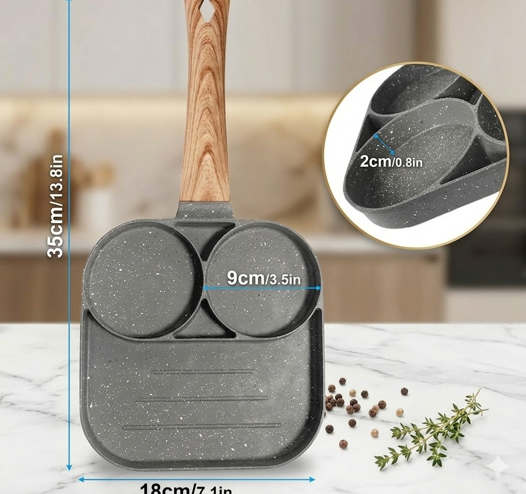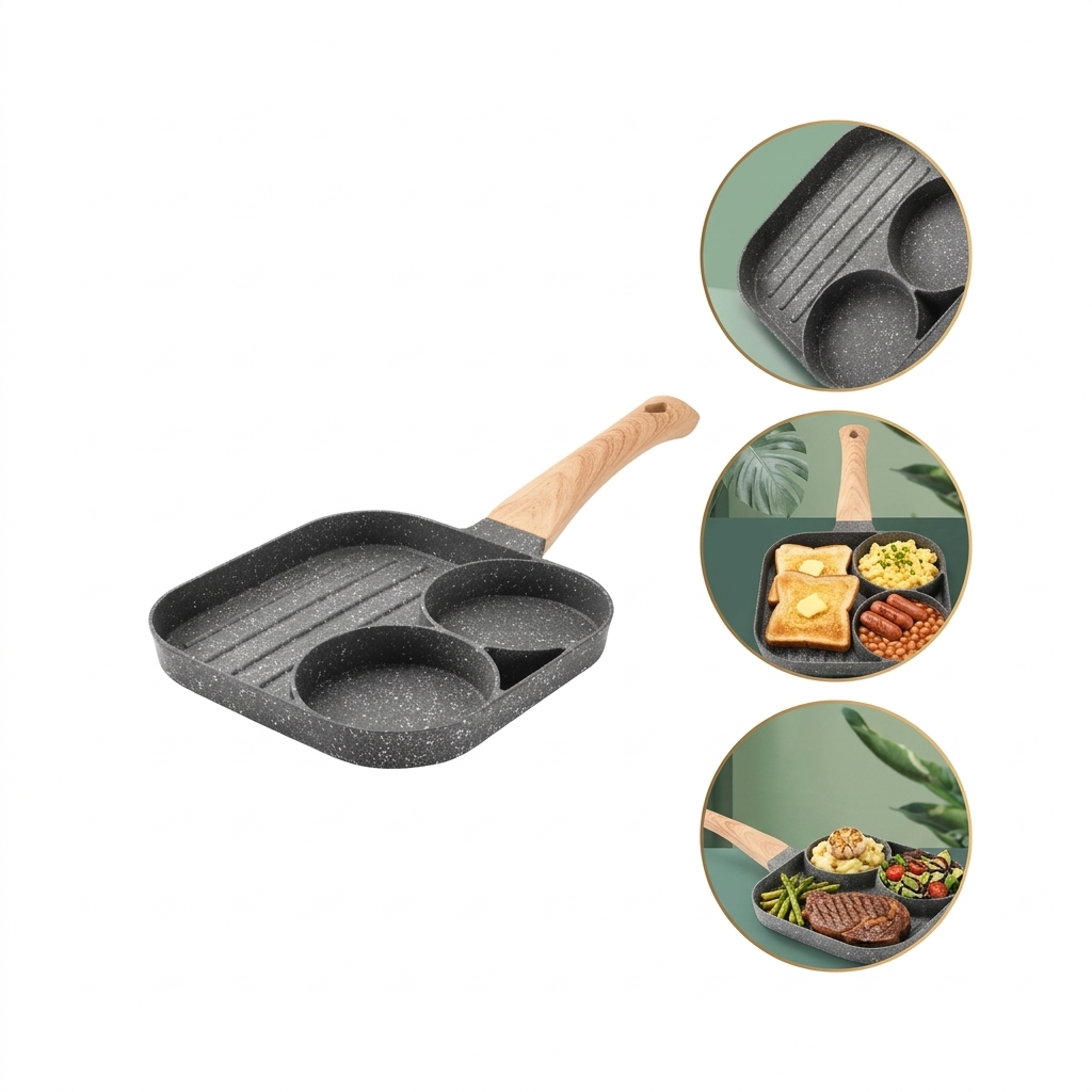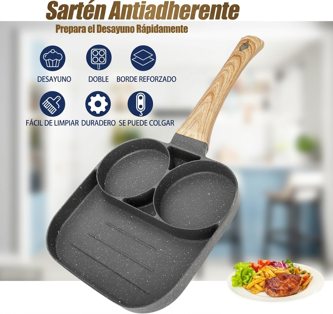 Esta sartén antiadherente multifuncional es la herramienta definitiva para optimizar tus mañanas, permitiéndote cocinar un desayuno completo en un solo lugar gracias a su diseño inteligente de tres compartimentos. Fabricada con un acabado de granito duradero y elegante, cuenta con dos secciones circulares ideales para lograr huevos o panqueques perfectamente moldeados, junto con una amplia sección estriada tipo grill para dorar carnes y vegetales con un acabado profesional.