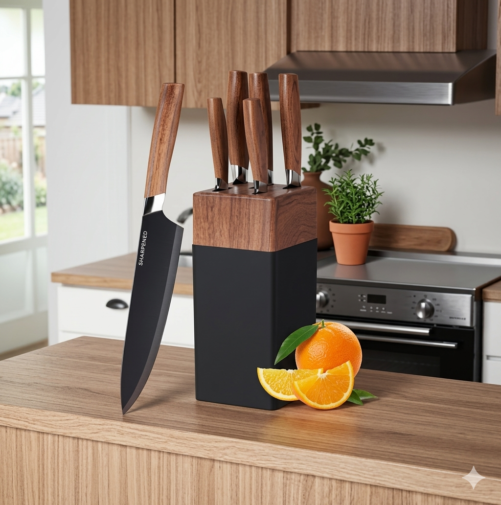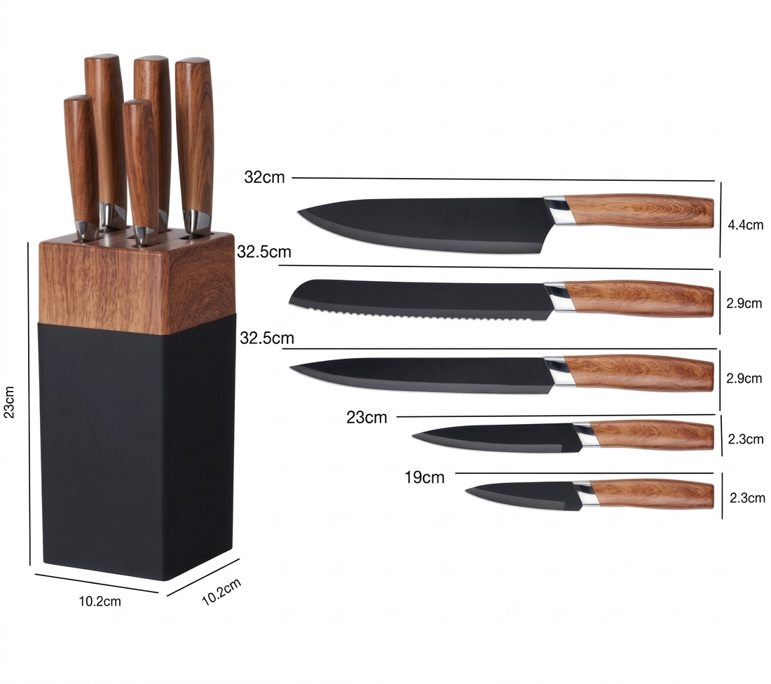 Este práctico set de cuchillos de cocina es la solución ideal para cubrir todas las necesidades de corte en el hogar. El conjunto incluye cinco piezas de distintos tamaños, desde un cuchillo de chef de 32 cm hasta uno pequeño de 19 cm y un pelador de verduras permitiendo picar, rebanar y pelar con facilidad. Cada cuchillo cuenta con una hoja de color negro mate y un mango de madera que ofrece un agarre cómodo y seguro. Además, el set se organiza en un bloque compacto de 23 cm de altura, diseñado para mantener la cocina ordenada y los cuchillos siempre al alcance de la mano.